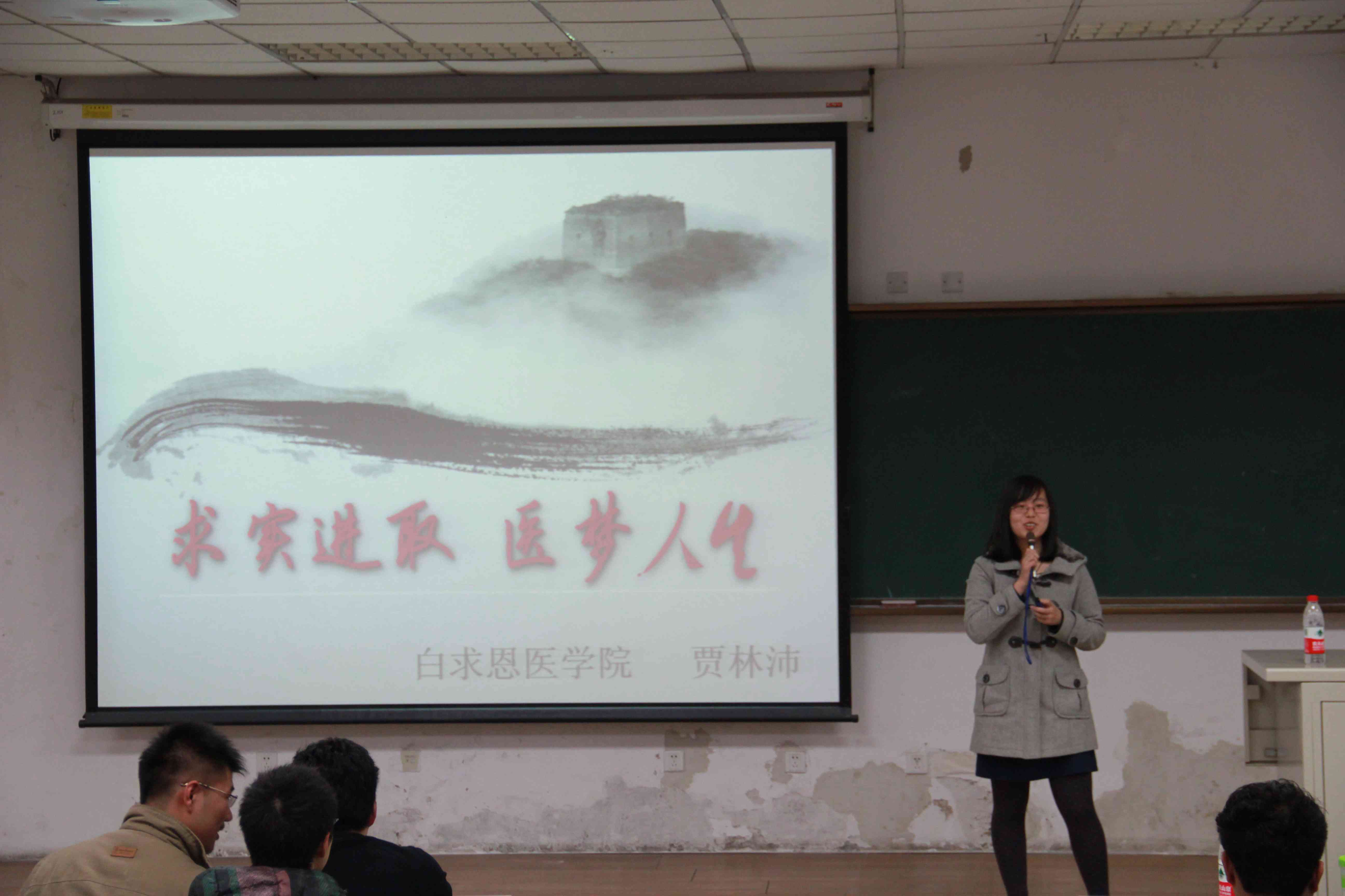 本次讲座的主题是“求实进取,医梦人生”。首先,贾林沛针对医员工今后将要面对的各项问题提出了个人见解。随后,她通过PPT的形式从学习、科研、员工活动、社会实践等四个方面向同学们分享了她的经验,并结合自身经历提出了许多建议。最后,团委第二副书记刘相良对本次讲座进行了总结。