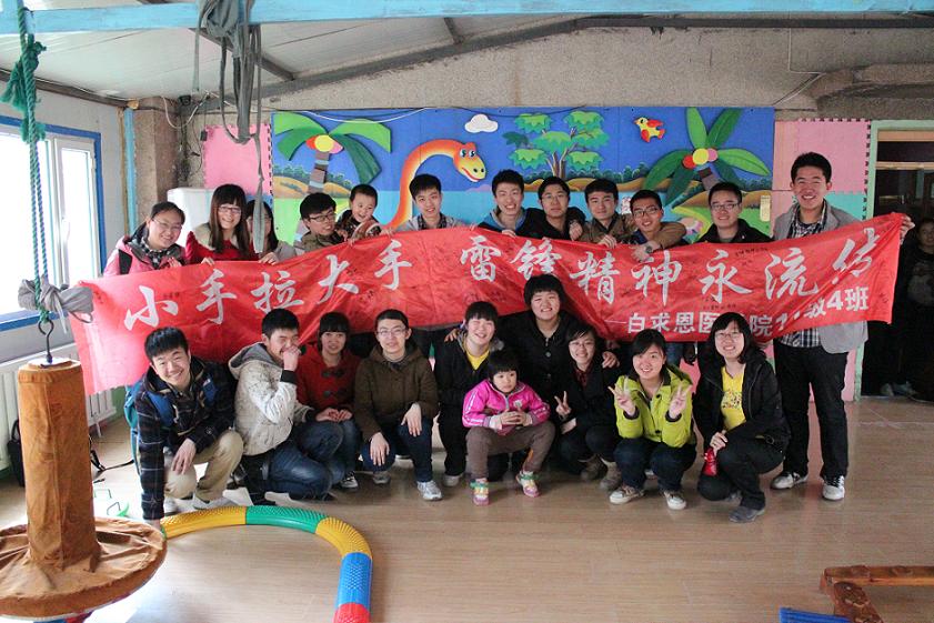 4月20日,701104班同学来到长春市宽城区育龙特殊儿童语言康复公司,走近自闭症儿童,帮助他们进行简单的日常自理行为训练,并用以清空零钱罐、收集废旧书籍纸张方式筹集的1000元爱心捐款为孩子们购买新桌椅。此外,701104班还在基础园区一公寓寝室楼下设立爱心捐助箱,收集同学旧衣物,并在雅安地震后将几百件衣物全部邮递给雅安市芦山县民政局,为灾区献一份爱心。